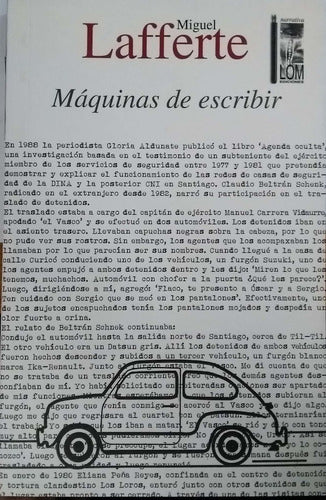TAPA BLANDA, LIBRO USADO, RECUERDA QUE UN % DE ESTA VENTA COLABORA CON FUNDACIONES QUE FOMENTAN LA LECTURA EN ZONAS VULNERABLES. Manuel Fuentes tiene treinta años y ha pasado los últimos dos trabajando en el "Departamento", una oficina pública dependiente del "Ministerio". Tiempo atrás ha trabado amistad con Enzo Cárdenas, un solitario y modesto ex militante del MIR que se gana la vida vendiendo las chucherías que acarrea en su destartalado Datsun. Un día Enzo obsequia a Fuentes un curioso documento. Se trata de una carta enviada por un agente de la CNI en 1982. Aparentemente no es más que una burocrática lista de actividades señaladas con palabras en clave. Una de ellas se titula: "Traslado de máquinas de escribir". Tiempo después el mismo Enzo le presentará a Roberto, miembro de Automóviles Desaparecidos (AA.DD.), una organización dedicada a esclarecer casos de derechos humanos, y que le brindará las pistas de un perturbador secreto. Esto será el punto de partida para un viaje de ida y venida por el tiempo y la geografía nacional, una aventura personal y a la vez colectiva por llegar a una verdad aún incierta. Miguel Lafferte nos presenta aquí su primera novela, Máquinas de escribir, un relato rico en imágenes y plasticidad narrativa, tejido de intrigas y crímenes, en un período de la historia nacional, la dictadura militar, recreado ahora desde un presente que sale a la caza de un trozo de verdad y una oportunidad de liberación de aquel pasado.
